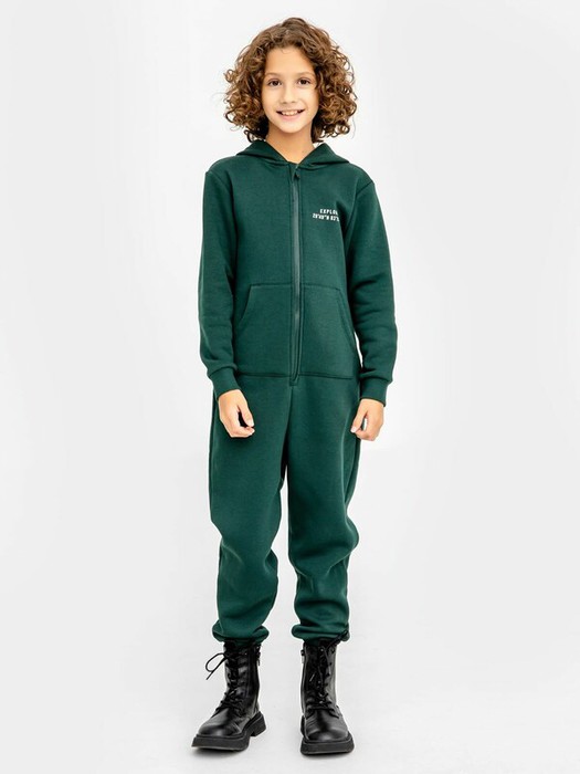 Свободный детский комбинезон из трикотажного футера с теплым подчесом. Удобный капюшон и карман-кенгуру, а также спущенная линия плеча и углубленные проймы делают этот комбинезон максимально удобным. Рукава длинные, застегивается комбинезон на молнию. Уютно!