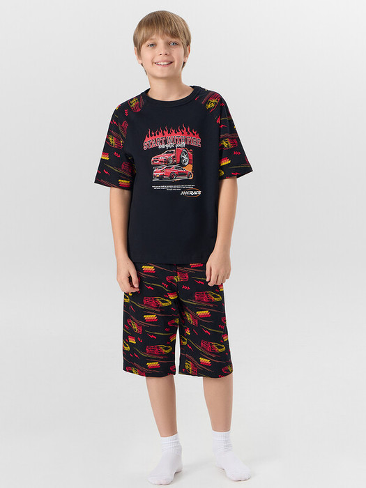 Шорты свободные, прямые. Пояс цельнокроеный с эластичной тесьмой внутри (внутрення резина 30RV), ширина 30 мм. Низ джемпера, рукавов и брюк обработаны на 2-х игольной плоскошовной машине швом в подгибку.