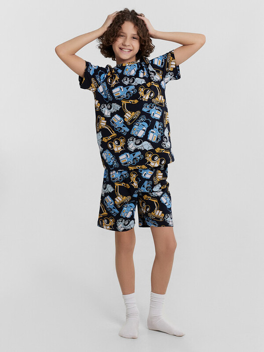 Пижама для мальчиков. Выполнена из хлопкового трикотажа кулирного переплетения. Комплект включает футболку и шорты. Футболка свободная, с круглой горловиной и короткими рукавами. Шорты длиной до колен, с эластичной тесьмой в поясе. Отличный комплект для сна и отдыха!
