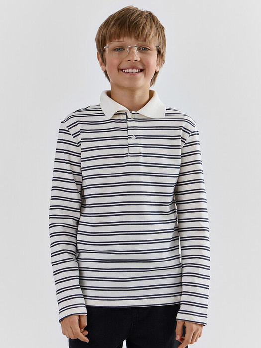 Поло для мальчиков прямого силуэта. Рукава втачные длинные. Плечо слегка спущено. Горловина округлый формы с рубашечным воротником из довяза DOV-16, DVC-85/001-0/5 . Шов обработки горловины - закрыт х/б тесьмой 10 мм 10TGY-O. По переду обработана застежка на петли и пуговицы d=10 mm.