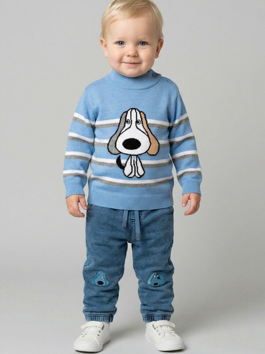 Детские брюки для мальчика. Модель прямого силуэта, выполнена из мягкого хлопкового трикотажа с эффектом денима. У брюк высокий комфортный пояс на широкой резинке и шнурок для регулировки. Спереди — два удобных кармана. Сзади один накладной карман. Декоративные аппликации с милыми собаками. В нижней части брючин предусмотрены эластичные трикотажные манжеты для лучшей посадки.