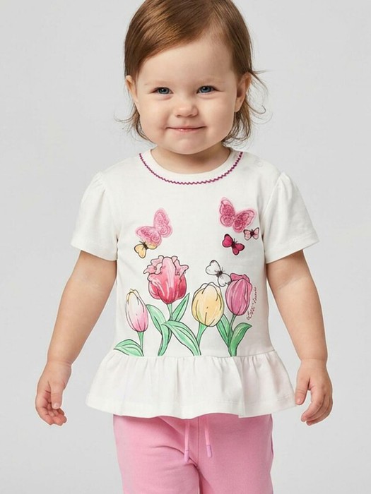 Детская футболка для девочки. Модель прямого кроя, выполнена из эластичного хлопкового трикотажа джерси. Спереди расположен крупный принт с цветами и бабочками. Горловина круглая. На плече застежка на кнопки для удобного переодевания. По низу - декоративная оборка.