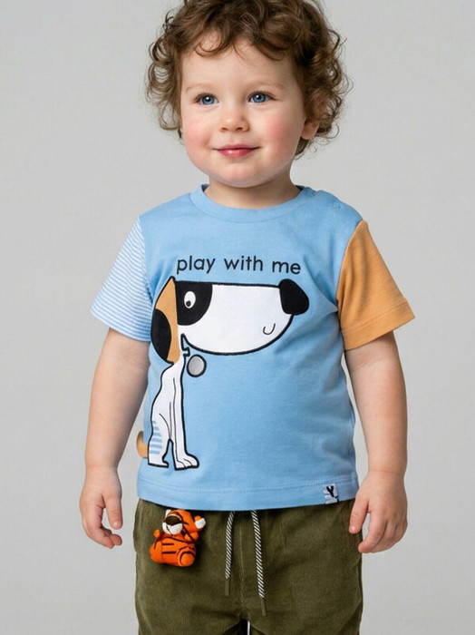 Детская футболка для мальчика. Модель прямого кроя, выполнена из мягкого хлопкового трикотажа интерлок. Спереди расположена крупная аппликация с милой собачкой. Горловина круглая, обработана эластичным рибом. На плече застежка на кнопки для удобного переодевания. В нижней части — небольшая нашивка.