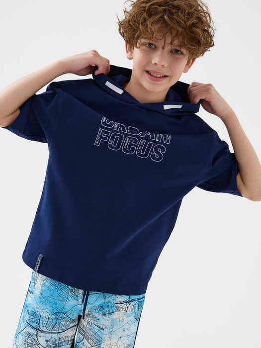 Футболка оверсайз с капюшоном для мальчика подростка. Модель выполнена из эластичного хлопкового трикотажа футер. Спереди расположен крупный принт. По спинке и низу - декоративные нашивки.