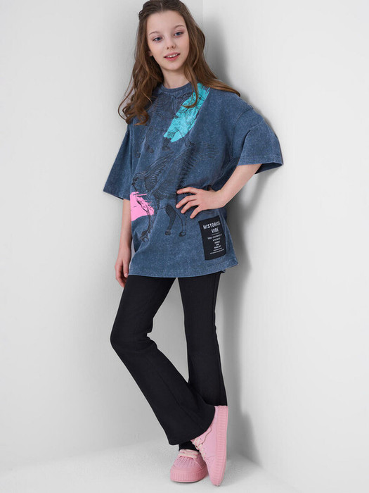 Футболка оверсайз для девочки подростка. Модель удлиненная, выполнена из меланжевого хлопкового трикотажа джерси. Спереди - крупный красочный принт. Горловина круглая. В нижней части — небольшая нашивка.