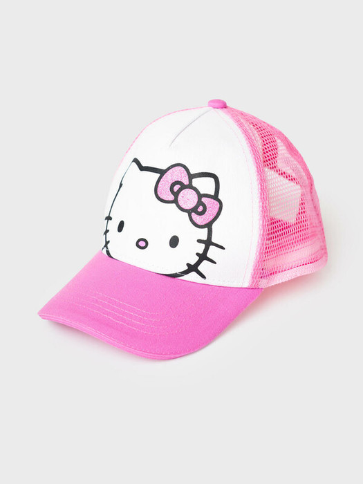 Детская бейсболка с Hello Kitty для девочки. Основная часть изделия — белая, с ярко-розовыми вставками и деталями. Спереди расположен крупный принт с изображением Hello Kitty, дополненный блестящим и объёмным эффектом. Козырек слегка изогнутый. Боковые и задние части изготовлены из дышащей сетки. Сзади — пластиковая застежка на кнопках для регулировки размера.