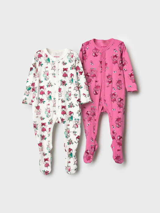 Комплект из двух мягких детских комбинезонов с закрытыми ножками для новорождённой девочки. Один из них выполнен в светлой цветовой гамме с яркими принтами цветов и кукол, второй — в насыщенном розовом цвете. Комбинезоны имеют длинные рукава, застёгиваются спереди на кнопки, которые продолжаются по внутренней стороне ножек для удобства переодевания. В размерах 56 и 62 предусмотрены отвороты на рукавах, выполняющие функцию варежек. Материал - 100% хлопковый трикотаж интерлок.