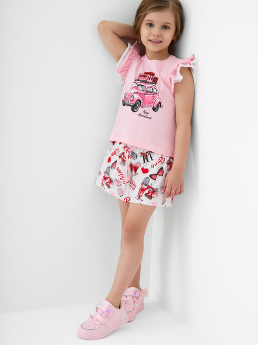 Легкий детский костюм для девочки. Состоит из футболки с коротким рукавом и шорт. Футболка прямого силуэта, выполнена из мягкого хлопкового трикотажа. Эффектные многослойные рукава с воланами, которые создают нарядный и лёгкий образ. На передней части расположен яркий принт, на спинке — аккуратная декоративная нашивка. Шорты выполнены из хлопковой ткани с ярким принтом. Посадка высокая, пояс на мягкой резинке дополнен декоративным шнурком. Есть удобные боковые карманы.