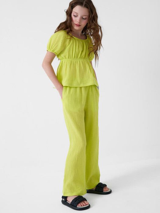 Легкий летний комплект для девочки подростка. Состоит из укороченной блузки и широких брюк. Материал – мягкий хлопковый муслин, дышащий и приятный к телу. Блузка с пышными короткими рукавами и сборкой на резинке по талии, что создает аккуратную и женственную форму. Брюки – длинные и свободные, с высокой посадкой и резинкой на поясе. По бокам — удобные карманы.