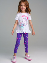 Детский легкий комплект для девочки. Состоит из футболки и прямых брюк на резинке. Выполнен из хлопкового трикотажа. Футболка свободная, с округлым вырезом и мягкой сборкой по горловине и низу, за счёт чего выглядит воздушной и комфортной. Брюки на резинке — прямые, со средней посадкой.