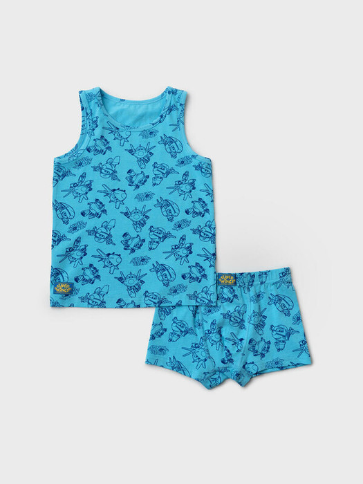 Детский комплект для мальчика, состоящий из майки и трусов-боксеров. Майка без рукавов, с классической круглой горловиной и ярким принтом с героями мультфильма "Super Wings". Пояс трусов выполнен из эластичной тесьмы для удобной посадки. Комплект выполнен из приятного хлопкового трикотажа.