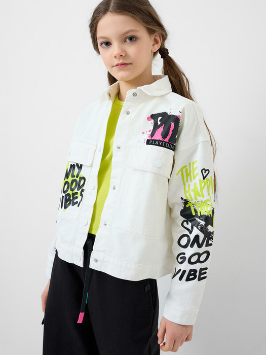 Джинсовая куртка для девочки подростка. У куртки два накладных кармана на кнопках, центральная застежка на болты и классический воротник. Модель из плотного молочно-белого денима украшена яркими принтами в стиле уличного граффити.