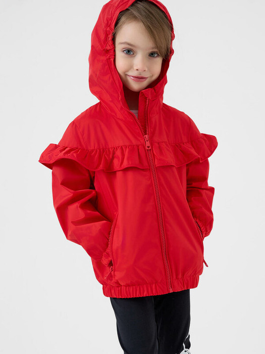 Ветровка детская для девочки. Температурный режим от +20С до +10С. Ткань с ветрозащитным и водоотталкивающим покрытием. Внутри гладкая подкладка. Капюшон несъемный на резинке. По бокам расположены два кармана на молнии. Внутренний карман на липучке. На манжетах и по низу изделия эластичная резинка. Есть светоотражающие элементы для безопасности.