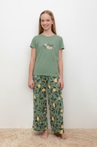 Пижама для мальчика подростка. Комплект состоит из футболки оверсайз с коротким рукавом и удобных шорт. Оба изделия выполнены из мягкого хлопкового трикотажа с ярким и стильным принтом. Футболка свободного кроя с круглым вырезом, а шорты оснащены эластичным поясом и шнурком для регулировки. Также у шорт есть удобные боковые карманы. Можно составить family look cо взрослым вариантом пижамы аналогичного дизайна.