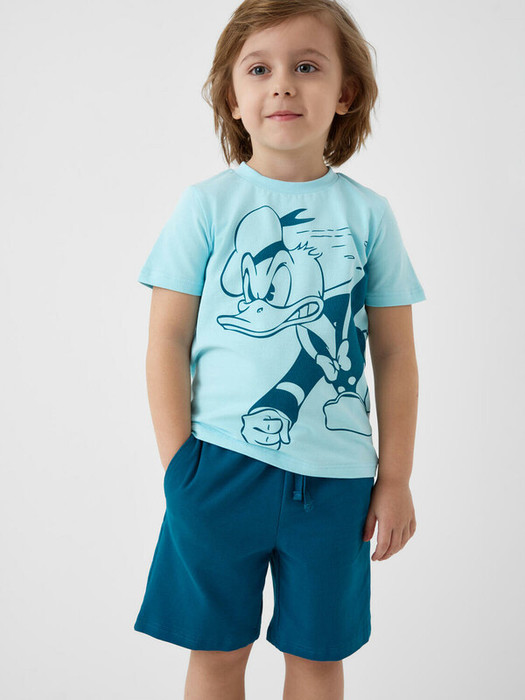 Пижама детская для мальчика. Комплект состоит из футболки, прямого кроя с короткими рукавами и шорт. На футболке яркий и крупный принт с Дональдом Даком. Шорты оснащены удобным эластичным поясом с шнурком для регулировки. Есть боковые карманы. Материал — мягкий и комфортный хлопковый трикотаж.