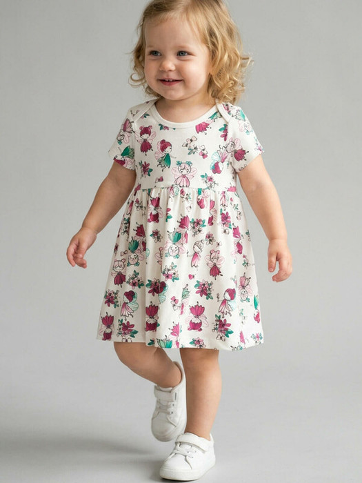 Детское платье-боди для девочки. Выполнено из хлопкового мягкого трикотажа интерлок. Короткие рукава и удобная застёжка на кнопки между ножек. Платье с широкой юбкой, создающей нарядный и свободный силуэт. Украшено ярким и сказочным принтом с феями и цветами.