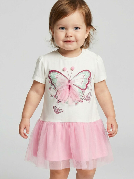 Нарядное детское платье для девочки. Модель из комбинации хлопкового трикотажа джерси и сетки. Верх выполнен в виде футболки с округлой горловиной, рукавами-фонариками и милым принтом бабочки. Бабочка украшена объёмными элементами: крылья из розовой сетки и мягкие помпоны. Нижняя часть — пышная юбочка из двух слоёв розовой сетки. На плече — кнопки, чтобы платье было удобно надевать через голову.