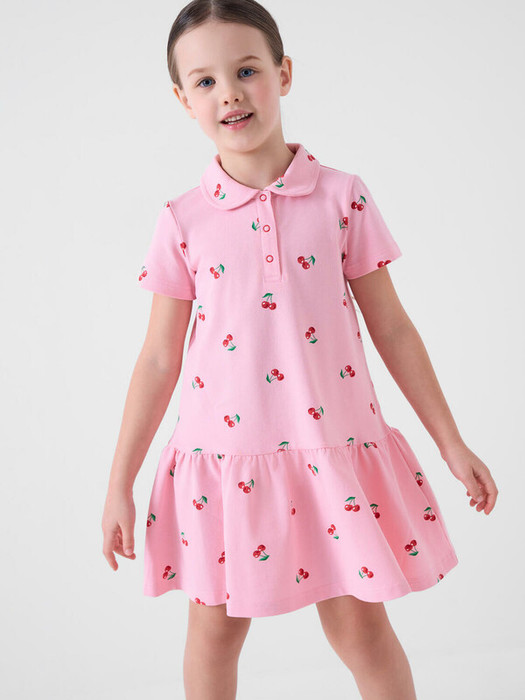 Летнее детское платье-поло для девочки. Выполнено из мягкого хлопкового трикотажа пике с милым принтом вишен. Короткие рукава с отворотами, классический воротник поло и застежка на кнопки спереди. По низу — присборенная юбка, создающая нежный силуэт.