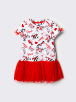 Лёгкое детское платье для девочки. Выполнено из мягкого хлопкового трикотажа джерси. Верхняя часть — как футболка с короткими рукавами и круглым вырезом, украшена ярким принтом с модными элементами и надписями. Рукава дополнены декоративными бантиками. Низ изделия — двухслойная юбка насыщенного красного цвета: верхний слой из сетки добавляет воздушности, нижний — из мягкого трикотажа для комфорта.