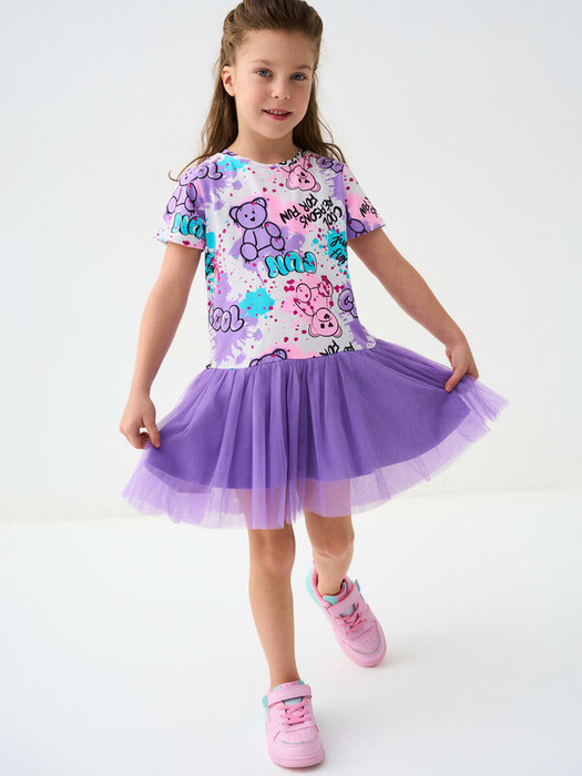 Легкое детское платье для девочки. Модель из комбинации хлопкового трикотажа джерси и сетки. Верх выполнен в виде футболки и украшен ярким принтом в стиле граффити. Пышная юбка из сетки придаёт изделию нарядный вид.