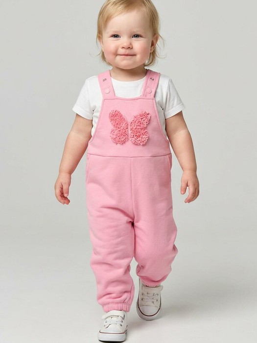 Лёгкий и удобный трикотажный полукомбинезон для девочки. Выполнен в мягком розовом цвете и украшен ярким декором в виде бабочки. Изделие имеет широкие лямки на кнопках, которые перекрещиваются на спине, эластичную резинку на талии и по низу штанин для комфортной посадки. По бокам расположены удобные карманы.