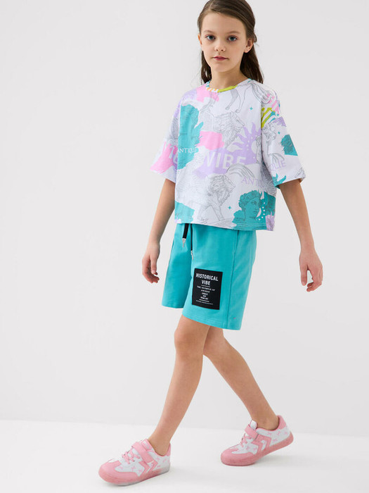 Шорты для девочки подростка. Модель свободного кроя из мягкого, хлопкового трикотажа футер. Удобная посадка обеспечивается эластичным поясом со шнуром. Спереди — боковые карманы и декоративная нашивка.