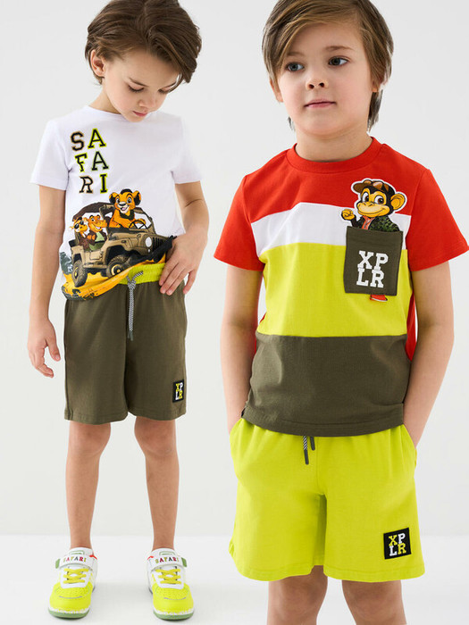 Набор детских шорт для мальчика. В комплект входят две пары шорт свободного кроя, длиной выше колена. Модели из мягкого, хлопкового трикотажа джерси. Удобная посадка обеспечивается эластичным поясом со шнуром. По бокам расположены два кармана.