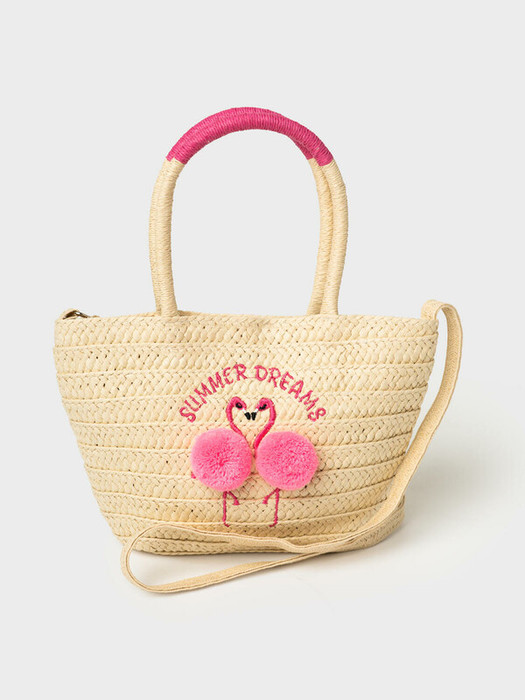 Оригинальная пляжная сумка кросс-боди для девочки. Сумочка-корзинка из искусственной рафии декорирована объемной аппликацией фламинго. Плечевой ремень регулируется. Сумка имеет одно отеделение.  Параметры сумки: высота - 16 см, ширина - 27 см, глубина - 7 см