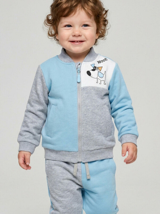 Толстовка детская на молнии для мальчика. Прямой крой. Выполнена из хлопкового футера без начеса. Стильный дизайн колорблок и принт с милой собачкой. Спереди два кармана. Низ изделия и рукава оформлены эластичными резинками.