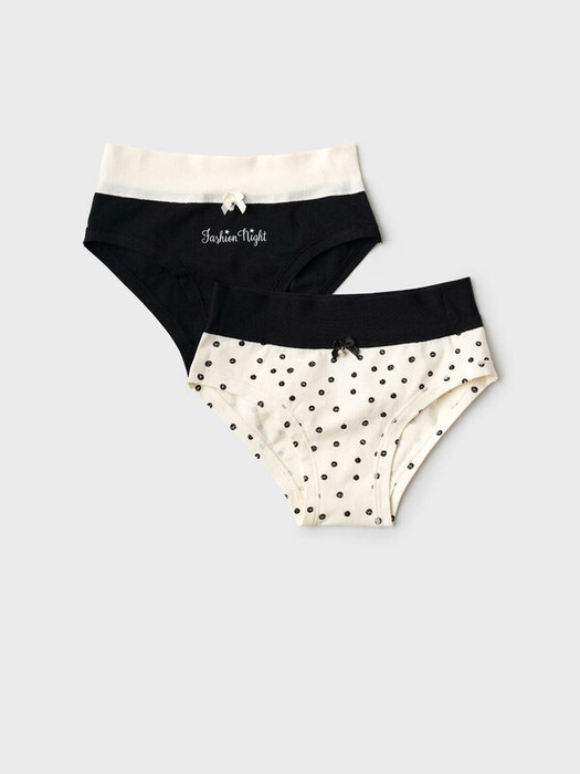 Комплект из двух трусов-брифов для девочки подростка. Одна модель выполнена в чёрном цвете с молочным поясом. Вторая — в молочном цвете с чёрным гороховым принтом и чёрным поясом. Оба изделия украшены аккуратным бантиком спереди и выполнены из мягкого эластичного трикотажа. Пояс и края ножек прошиты плоскими швами, что обеспечивает комфорт при носке.