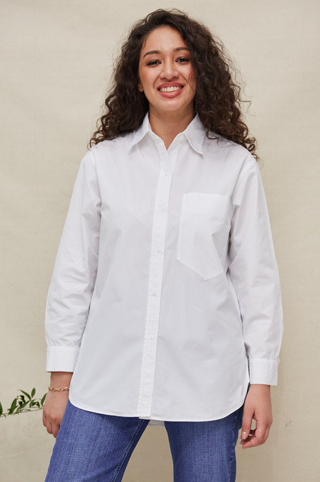 Рубашка из хлопковой ткани свободного силуэта с застёжкой на планке. Низ изделия с закруглениями по бокам и разрезами. Рубашечный рукав на манжете с застёжкой на пуговицы. Вырез горловины обработан отложным воротником на стойке. На задней части изделия выполнена кокетка с небольшой складкой. На передней-накладной карман в области груди. Достоинство этой модели в способности скрыть некоторые недостатки фигуры. Её можно сочетать как с брюками, так и с джинсами.