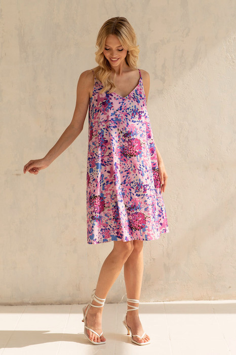 Платье на тонких бретелях из вискозной плательной ткани. Свободный силуэт, расширенный книзу. В боковых швах карманы. Лиф двухслойный с красивым V-образным вырезом. V-образный вырез и тонкие бретельки создают воздушный образ, делая акцент на линию плеч и шеи. Свободный покрой платья идеально садится по фигуре. В таблице размеров представлены параметры человека, а не изделия.