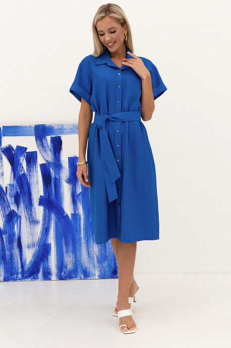 Платье - рубашка из вискозной ткани с крэш-эффектом. Свободный силуэт с застёжкой на планке. Вырез горловины обработан отложным воротником на стойке. Короткий рубашечный рукав с отворотом. На задней части изделия выполнена кокетка с небольшой складкой. На передней-накладной карман в области груди. В комплекте пояс из основной ткани.