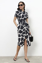 Платье полуприлегающего силуэта из эластичного полотна с жаккардовым узором. Вырез горловины оформлен воротником-стойкой. Рукав втачной.