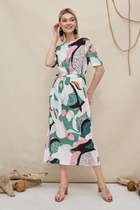 Платье с запахом фиксирующимся притачным поясом выполнено из плательной ткани. Отрезное в области талии. Лиф прилегающий. Юбка летящего силуэта. Укороченный втачной рукав со сборкой по окату.