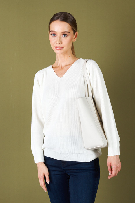 Джемпер прямого силуэта с фактурой «жемчужный узор». Рукав реглан. V-образный вырез горловины. Низ изделия и низ рукава оформлены резинкой. Изделие выполнено из мягкой структурированной пряжи.