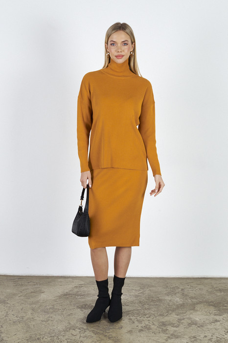 Костюм из джемпера и юбки с рисунком в узкий рубчик. Юбка прилегающего силуэта. Пояс с эластичной резиной. Джемпер свободного силуэта. Рукав втачной в спущенную пройму. Вырез горловины оформлен воротником-стойкой с отворотом. Изделие выполнено из мягкой структурированной пряжи.