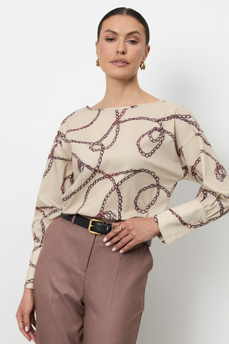 Блуза свободного силуэта из вискозной ткани. Втачной рукав на высокой манжете с застёжкой на пуговицы. Круглый вырез горловины обработан косой бейкой. По среднему шву спинки застёжка на петлю-пуговицу.