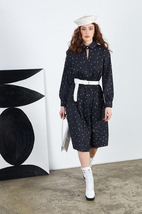 Платье свободного силуэта из вискозной ткани. Изделие по линии талии на резинке, на юбке-сборка. V-образный вырез горловины обработан отложным воротником на стойке. Втачной длинный рукав с манжетой, застегивающейся на пуговицы.