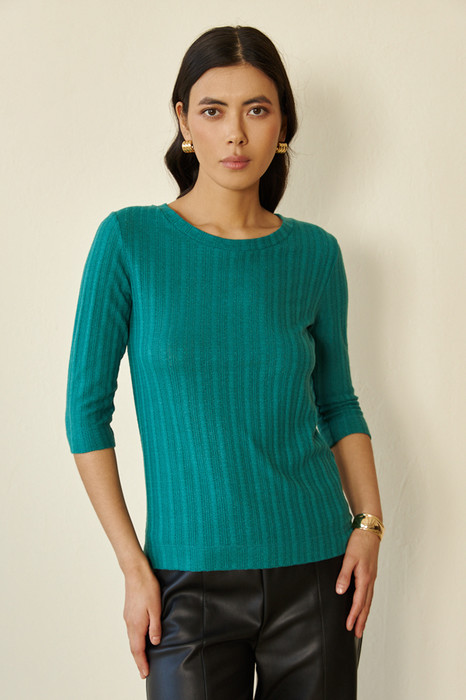 Джемпер прилегающего силуэта из фактурного эластичного полотна. Втачной рукав 3/4. Круглый вырез горловины оформлен бейкой.