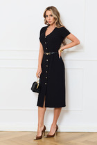 Платье из вискозной ткани с крэш-эффектом. Свободный силуэт с карманами в боковых швах. По центру передней и задней части изделия выполнен шов. Цельнокроеная стойка, переходящая в V-образный вырез горловины, визуально делает фигуру стройнее. Цельнокроеный короткий рукав. В комплекте пояс из основной ткани.