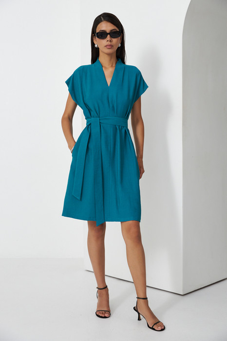 Платье из вискозной ткани с крэш-эффектом. Свободный силуэт с карманами в боковых швах. По центру передней и задней части изделия выполнен шов. Цельнокроеная стойка, переходящая в V-образный вырез горловины, визуально делает фигуру стройнее. Цельнокроеный короткий рукав. В комплекте пояс из основной ткани.