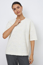 Платье свободного силуэта из вискозной ткани с крэш-эффектом. Изделие отрезное по линии бедра спереди и чуть ниже бедра на задней части. Верхняя часть юбки со сборкой. Втачной короткий рукав. Круглый вырез горловины оформлен косой бейкой из основной ткани. Сзади по среднему шву застежка-пуговица. В таблице размеров представлены параметры человека, а не изделия.