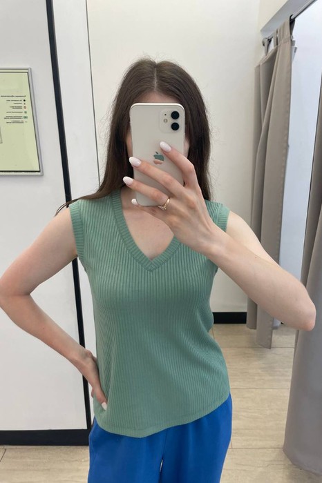 Джемпер прилегающего силуэта из эластичного полотна в рубчик. V-образный вырез горловины и линия проймы оформлены бейками.