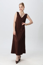 Платье свободного силуэта из плательной ткани. По центру передней части изделия выполнен шов. Цельнокроеная стойка, переходящая в V-образный вырез горловины, визуально делает фигуру стройнее. Втачной короткий рукав.