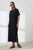 Платье свободного силуэта из плательной ткани. По центру передней части изделия выполнен шов. Цельнокроеная стойка, переходящая в V-образный вырез горловины, визуально делает фигуру стройнее. Втачной короткий рукав.