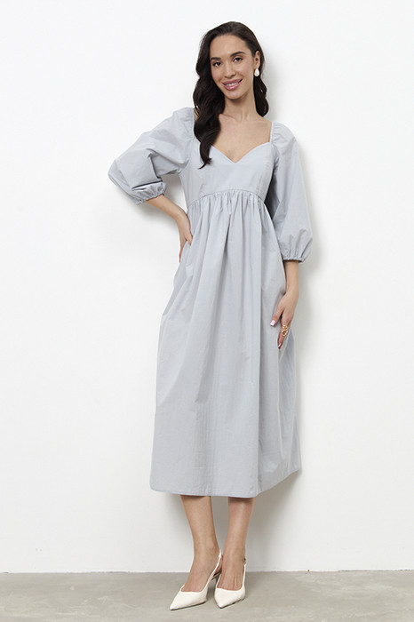 Платье свободного силуэта из хлопковой ткани. Изделие отрезное по линии талии. Линия талия завышена и фигурная. Верхняя часть юбки со сборкой. По среднему шву спинки потайная молния. Лиф переда и спинки двухслойный, имеет рельефные швы. Окат рукава и низ рукава зафиксированы резиной.