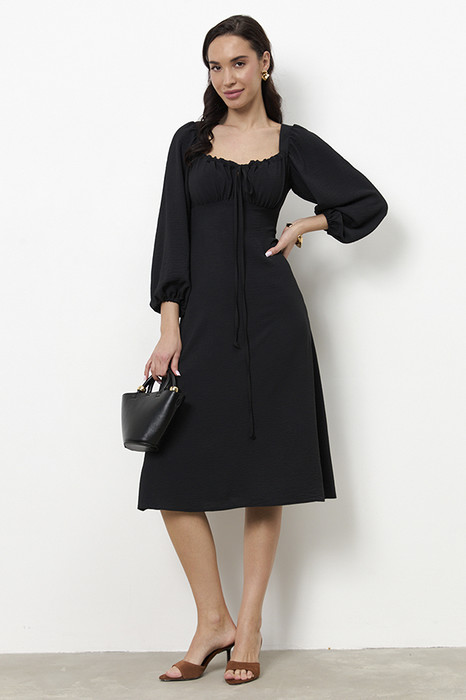 Платье приталенного силуэта, расширенное книзу из ткани с крэш-эффектом. Отрезное по линии талии. Верхняя часть с отрезным лифом, подрез фигурный. По верхнему краю лифа кулиска, в которую вставлены бретели-завязки, формирующие драпировку. Вырез горловины глубокий, расширенный, по форме напоминающий каре, с вырезом до линии подреза. Прилегание платья создано за счет рельефов на деталях переда и вытачек на деталях верхней и нижней части спинки. В верхней части среднего шва спинки застежка на потайную молнию. Рукава втачные, длинные, со сборкой по окату и низу рукава. В подгибку низа рукава вставлена резинка.