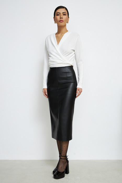 Юбка прилегающего силуэта из эластичного полотна, с покрытием, имитирующим кожу. По центру передней и задней части изделия выполнены швы, на передней части шов с декоративной строчкой. Сзади по среднему шву застёжка-молния, снизу шлица с разрезом. Изделие без пояса, верхний срез обработан обтачкой. На передней и задней половине юбки выполнены талиевые вытачки с декоративной строчкой.
