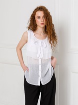 Блуза свободного силуэта из блузочной ткани. Низ изделия асимметричной длины (спинка удлинена относительно переда) с разрезами в боковых швах. Втачной рукав в спущенную пройму. V-образный вырез горловины оформлен косой бейкой из основной ткани.